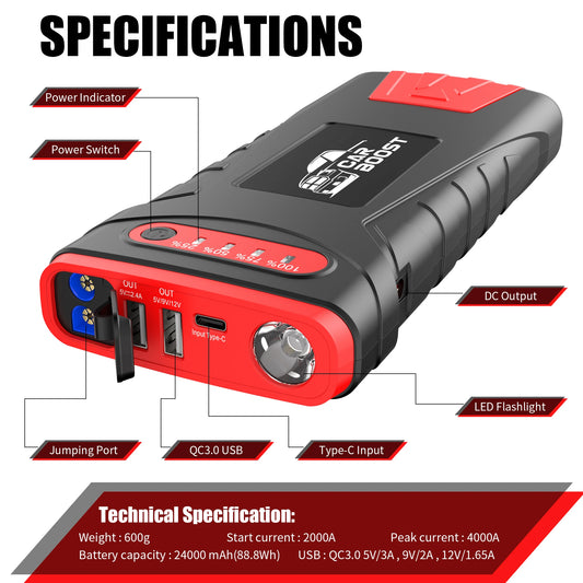 Booster de batterie de voiture, Banque d'alimentation 12V, 49800mAh