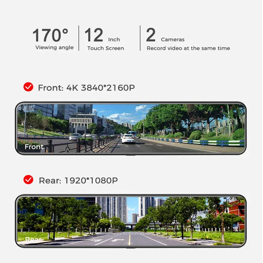 4K HD Dash Cam with 12" Touch Screen Rearview Mirror, Dual Lens, WiFi, and GPS.