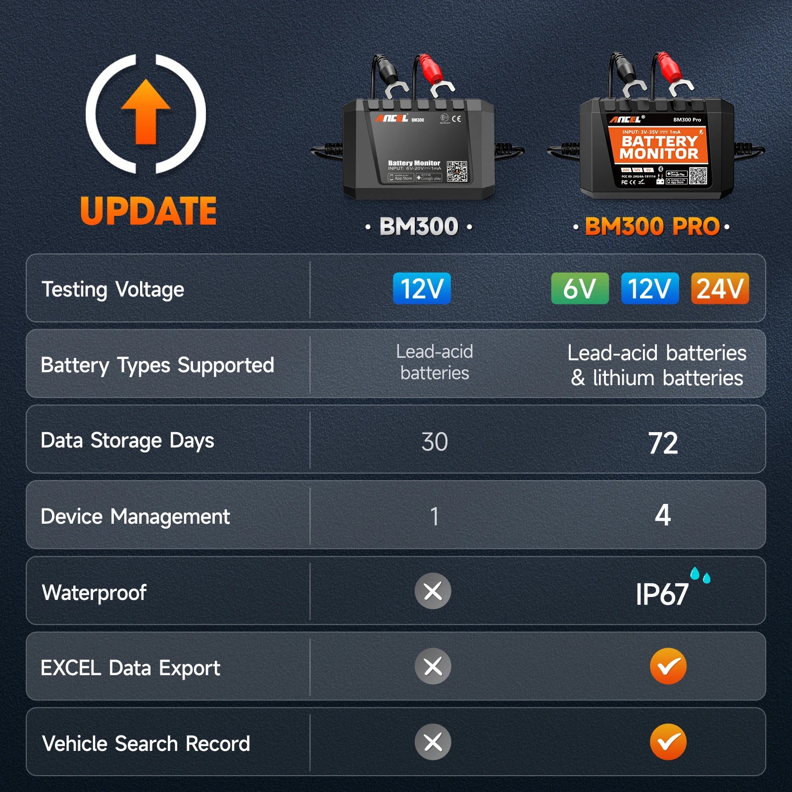 2024 New ANCEL BM300 Pro 6V/24V/12V Battery Tester Battery Monitor SOC Battery Health Analyzer Tool IOS Andoird