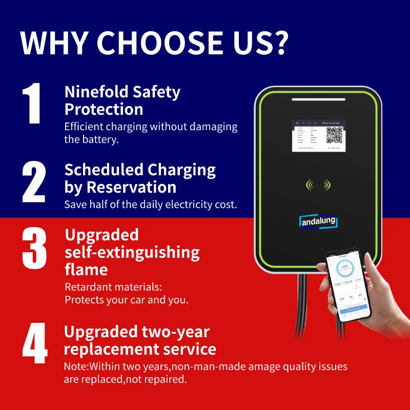 Plusieurs protections garantissent une utilisation sûre: Notre chargeur de voiture EV dispose de protections intégrées contre la foudre, les fuites de courant, les surintensités, les surchauffes, les sous-tensions et les surtensions, comme indiqué par la fréquence de clignotement variable de LED. Il s'éteindra automatiquement si une situation anormale se produit en cas de dommages à votre voiture.